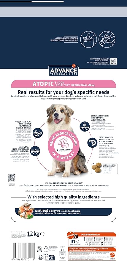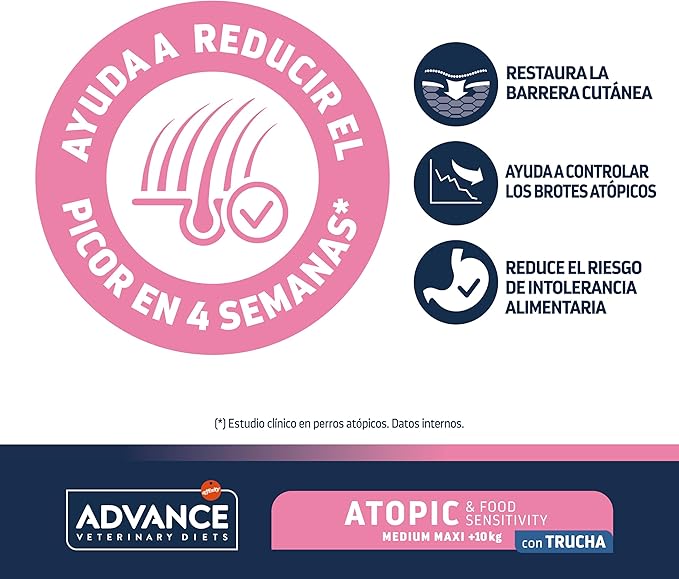 ADVANCE VETERINARY DIETS Atopic Medium/Maxi es un alimento dietético completo y equilibrado para perros medium/maxi, formulado para cuidar de la piel en caso de dermatitis y pérdida de pelo excesiva, así como para reducir de intolerancias a ingredientes y nutrientes.