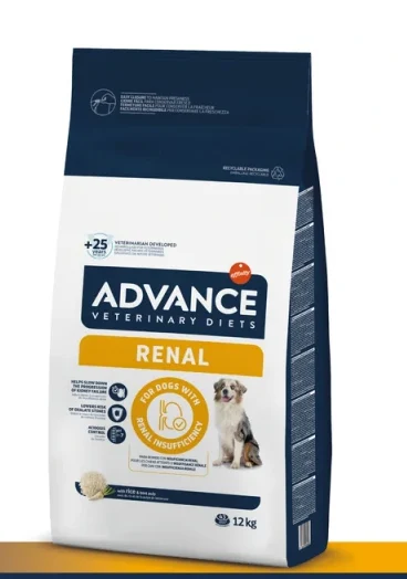 - ADVANCE VETERINARY DIETS RENAL es un alimento dietético completo para perros adultos, con un nivel limitado de proteínas, pero de alta calidad y con un bajo contenido en fósforo.
