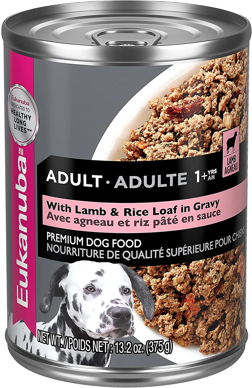 Latas de EUKANUBA con cordero y arroz enlatado para perros.