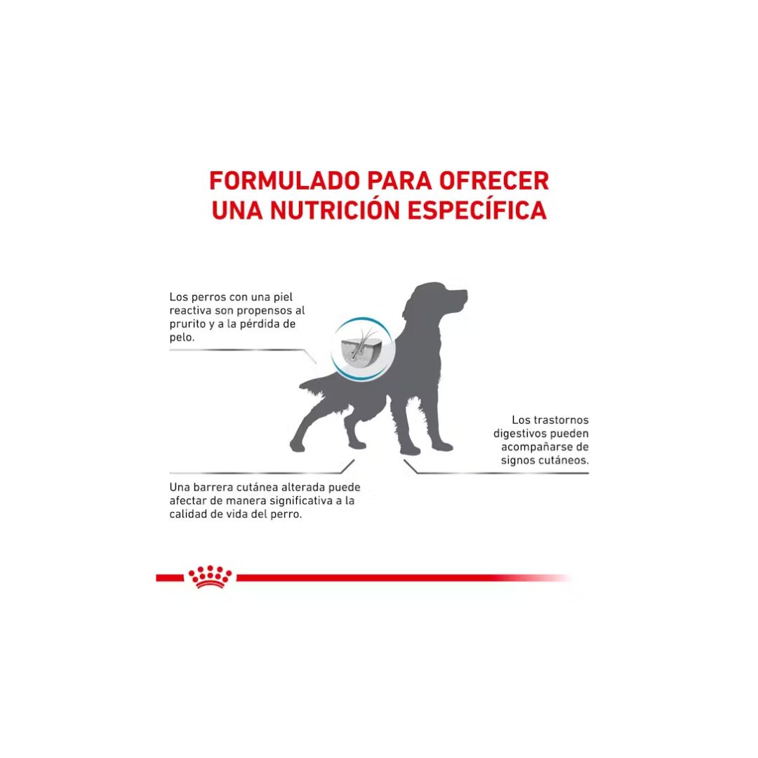 - Es un alimento veterinario especializado para perros con piel sensible, pérdida de pelo o dermatosis.
