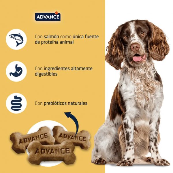 El SNACK ADVANCE SENSITIVE 150G, disponible en AGROPOMPETS y con envíos a todo El Salvador, es un snack hipoalergénico especialmente formulado para perros con piel delicada o sensibilidad digestiva. Su receta utiliza salmón como única fuente de proteína animal, ingredientes altamente digestibles y prebióticos naturales, lo que lo convierte en una opción ideal para mejorar la salud intestinal y el bienestar general de tu mascota.