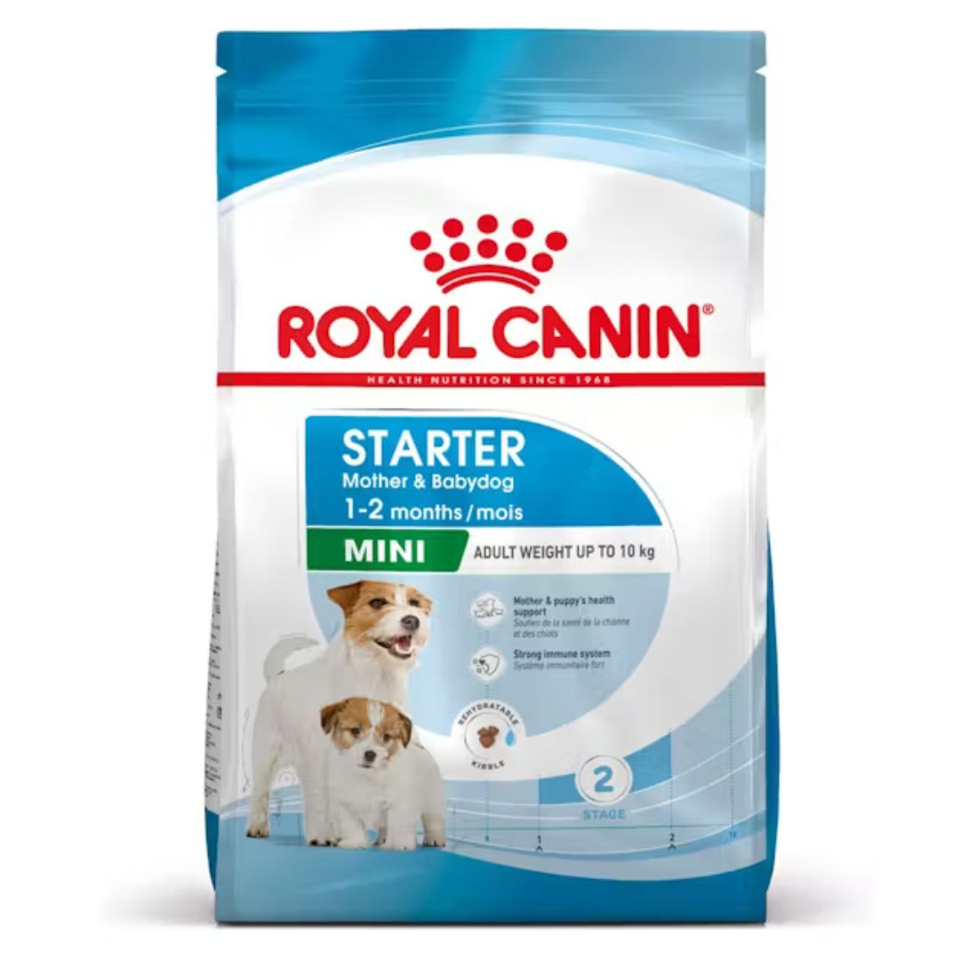 - Royal Canin Mini Starter Mother & Babydog es un alimento seco completo para perras de razas pequeñas en gestación o lactancia y sus cachorros en destete.