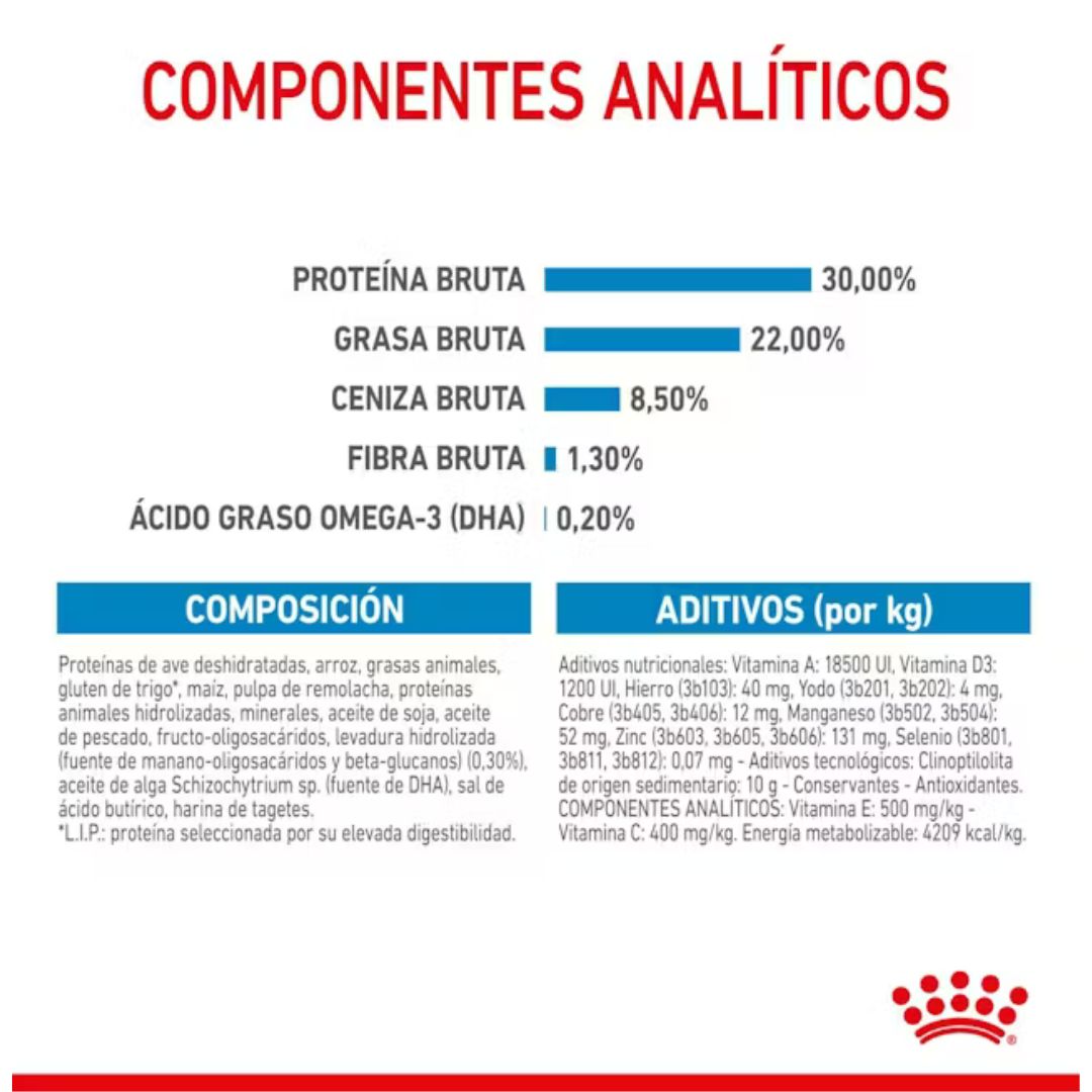 Proteína de ave de corral deshidratada, arroz, grasas animales, gluten de trigo*, maíz, pulpa de remolacha, proteínas animales hidrolizadas, minerales, aceite de soja, aceite de pescado, fructo-oligosacáridos, levadura hidrolizada (fuente de manano-oligosacáridos y beta-glucanos) (0,30%), aceite de alga Schizochytrium sp. (fuente de DHA), sal de ácido butírico, harina de tagetes.